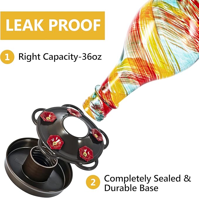 - LEAK PROOF: This vintage glass hummingbird feeder features a convenient 36 fluid ounces capacity, a slender shape and a completely sealed base that has the least leaking, drips and spills
