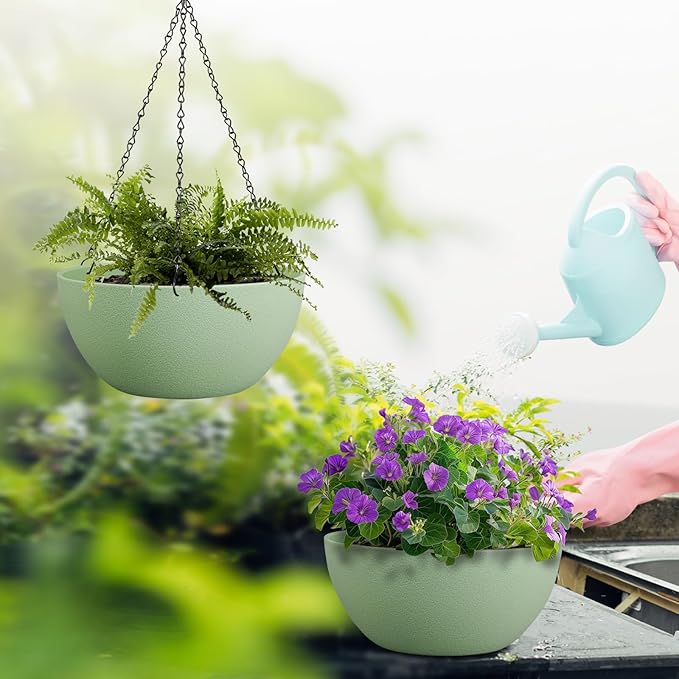 13 inch Large Hanging Planters Plant Pots for Outdoor Indoor Plants with Drainage Holes and Chain, 2 Pack Round Hanging Flower Pots for Garden Home Porch Decor, Green