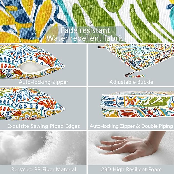 - ⭐Material: Made of 100% durable polyester fabric and soft filling material. It’s water repellent and fade-resistant. Won’t fading under the direct sunlight over 500 hours. Cushions are filled with 28D high resilient foam, overstuffed construction for enhanced comfort and longevity.