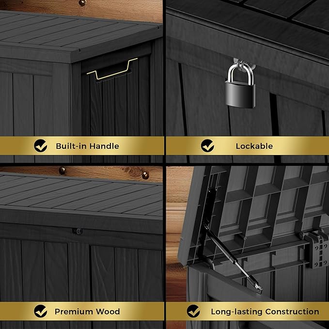- Material: The patio outdoor storage box is made of the latest high-quality resin material, which makes this patio deck storage box waterproof, UV-resistant, anti-fading, and anti-bending protection, suitable for long-term outdoor use.