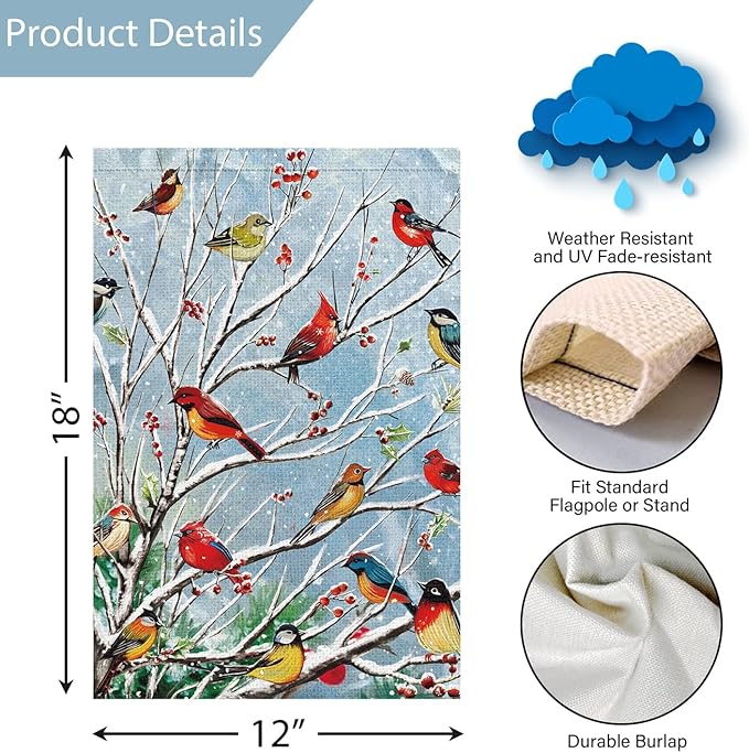 - For Winter Christmas Decorations: Bring the beauty of Christmas holiday to your outdoor space with our enchanting garden flag featuring tree adorned with charming cardinal birds. Add some seasonal atmosphere to your home decor, add a colorful, bountiful touch of the season to your home and garden.