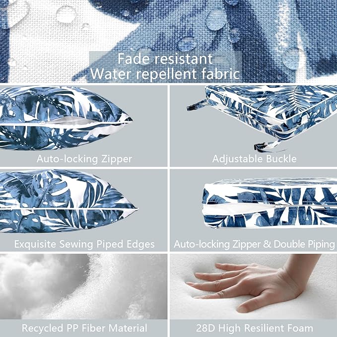 LVTXIII Outdoor Deep Seat Cushion Patio Seat and Back Cushion Set Seasonal Chair Cushion with Removable Cover and Adjustable Buckle for Home and Garden, 22"x22"x4", Palms Blue