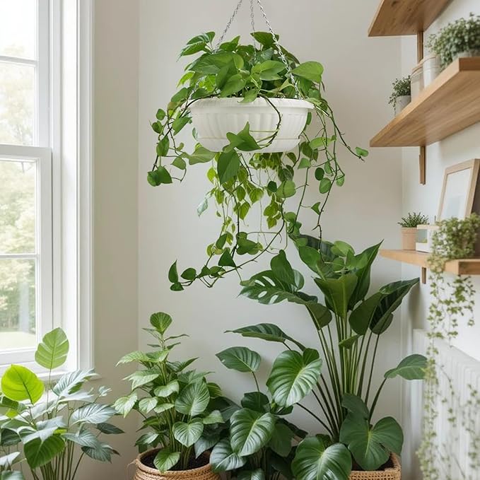 - Plant baskets are made of high quality plastic, light-weight. Coated metal chain, not easy to rust.