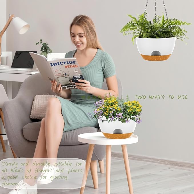 - 【Self-Watering Hanging Flower Pots with Removable Saucer】the appearance and structural design of the Hanging Pot prevents overwatering and acts as a water reservoir to promote Plant growth. It is suitable for a variety of Hanging Pot Plants, such as ivy, Herbs, Ferns, Philodendrons, Succulents, Flowers or other Plants