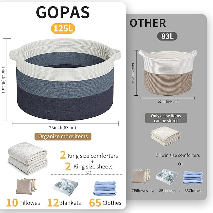 125L Extra Large Blanket Basket, 25" x 16", Jumbo Laundry Woven Basket Decorative Home, Cotton Rope Basket with Handles, Baby Toy Basket for Storage, Gradual Blue